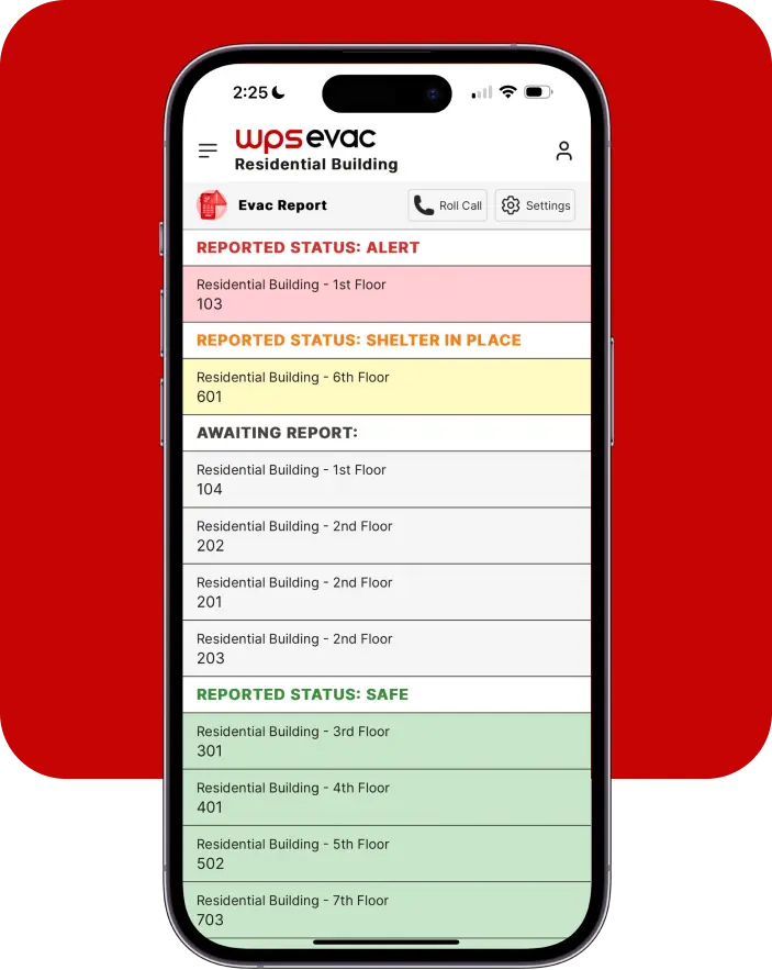 Tenants can provide real-time evacuation status directly from the Residential WPS Evac App or by answering or responding to a roll call.